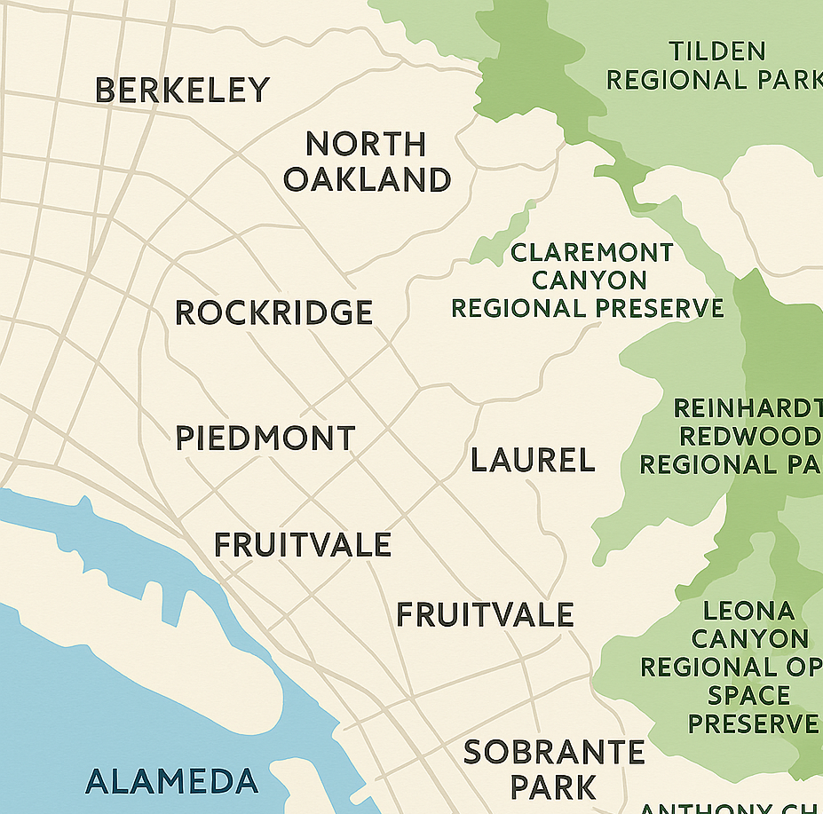 Oakland, Oakland Hills, Piedmont, Claremont, North Oakland, Rockridge, South Berkeley, Fruitvale.